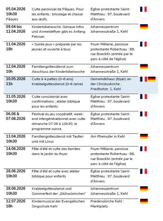 Wir hören Musik, singen, basteln, bewegen uns, lesen eine Geschichte aus der Bibel und beten… auf Deutsch und auf Französisch! Und unser Schäfchen macht natürlich mit.