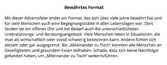 Mit einer Adventsfeier am 15. Dezember verabschiedete sich das ehrenamtliche Team und beendet damit ein langjähriges Projekt, das 2007 mit einer Vesperkirche begann.