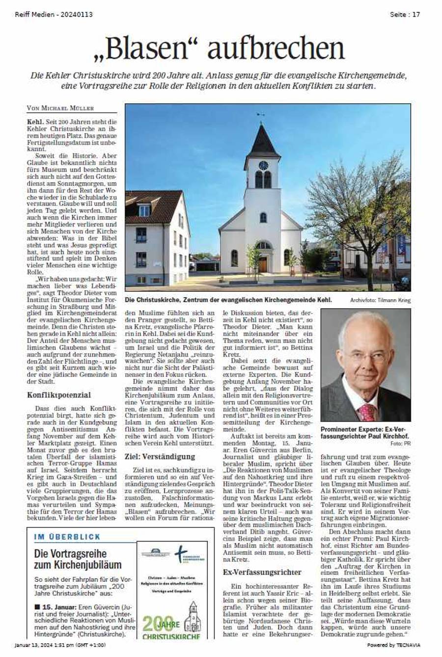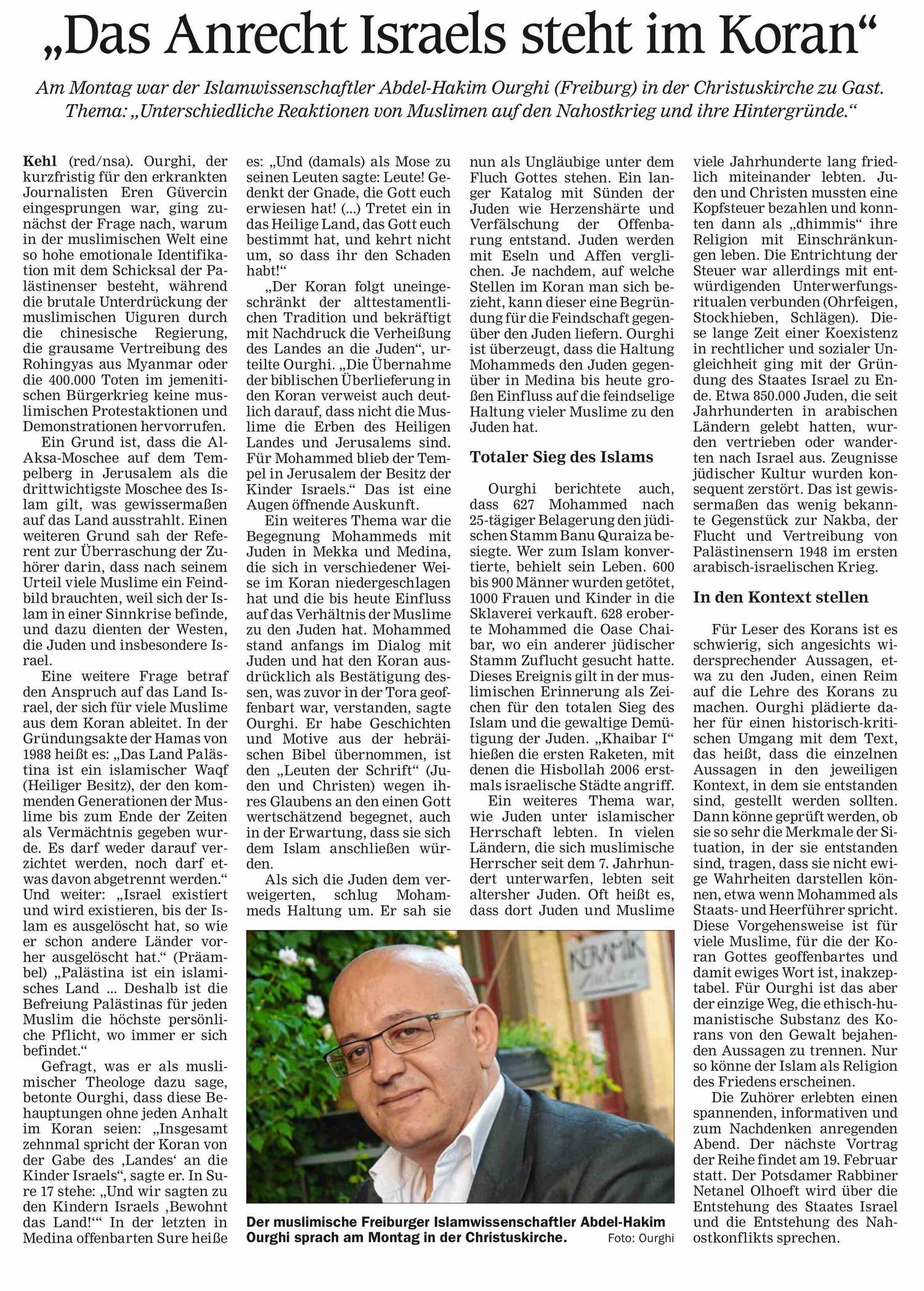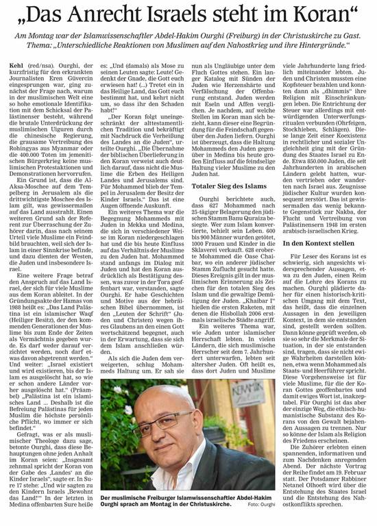 Im Rahmen der Vortragsreihe „Christen – Juden – Muslime: Religionen in den aktuellen Konflikten“, die die Evangelische Kirchengemeinde Kehl in Zusammenarbeit mit dem Historischen Verein aus Anlass des 200sten Geburtstags der Christuskirche veranstaltet, hat am 15. April der Tübinger Islamwissenschaftler Dr. Mahmoud Abdallah Antworten auf Fragen zum Thema „Das Bild, das der Koran von den Christen zeichnet“ gegeben.