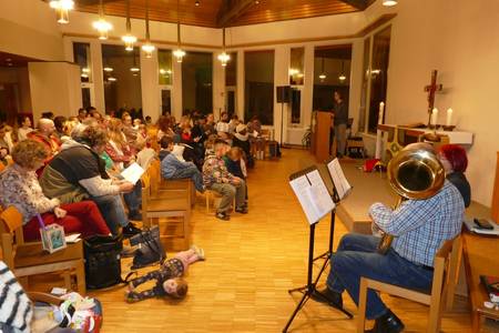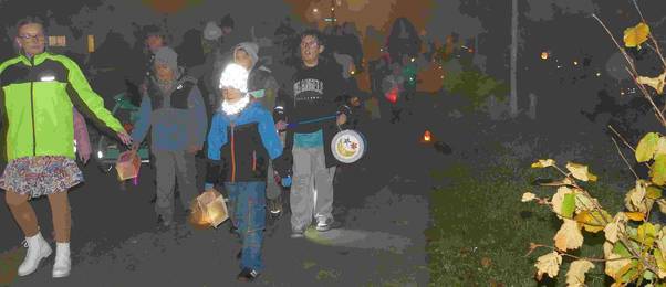 ![]() Nach der Andacht in der vollbesetzten Johanneskirche machten sich mehr als 40 Familien mit unzähligen Kinderwägen auf den Weg und leuchteten mit ihren Laternen durch den Abendnebel. | ![]() |