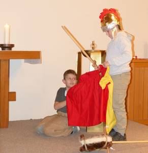 ![]() Das Fest begann mit einer Andacht in der vollbesetzten Johanneskirche zur Geschichte von Sankt Martin. | ![]() Zwei Kinder spielten die Geschichte nach, wie Martin seinen Mantel mit einem Bettler teilt. |